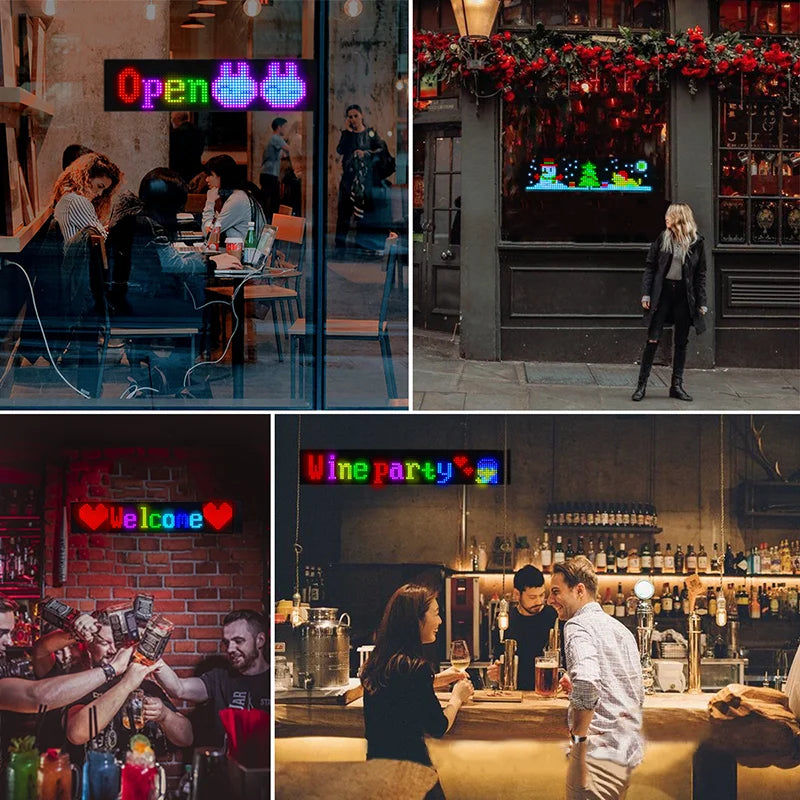 Diseñada con conexión Bluetooth y control mediante aplicación móvil, esta pantalla LED de matriz de píxeles es perfecta para autos, escaparates, bares y eventos.