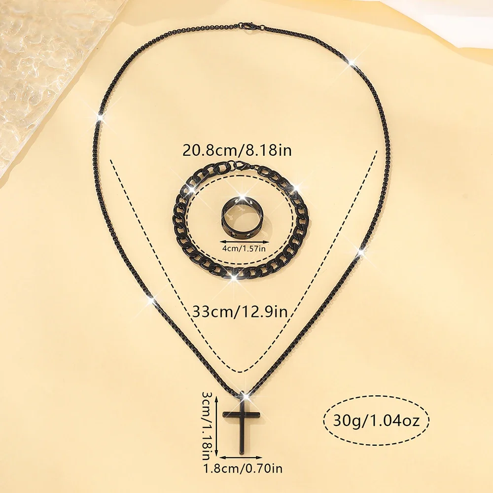 Set de Joyería para Hombre 3 Piezas – Collar con Cruz, Pulsera y Anillo en Acero Inoxidable Estilo Hip Hop